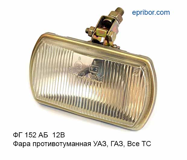 Фара противотуманная ФГ 152 А. Размер светового отверстия 80х160 мм; тип лампы накаливания по ГОСТ 2023-75: Н1 12-55;