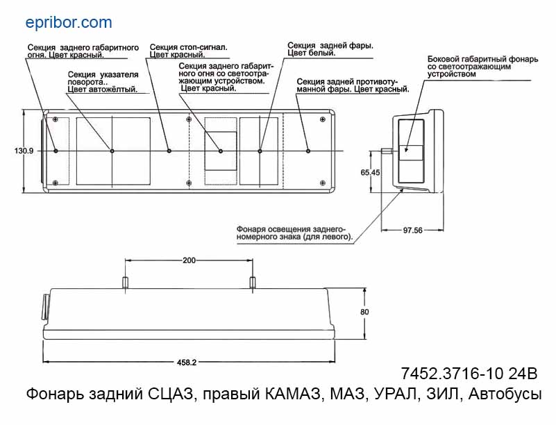 Выполняет функции: габаритного (контурного) огня, указателя поворота, стоп-сигнала, заднего габаритного огня, задней фары, заднего противотуманного огня, бокового габаритного фонаря со светоотражающим устройством.