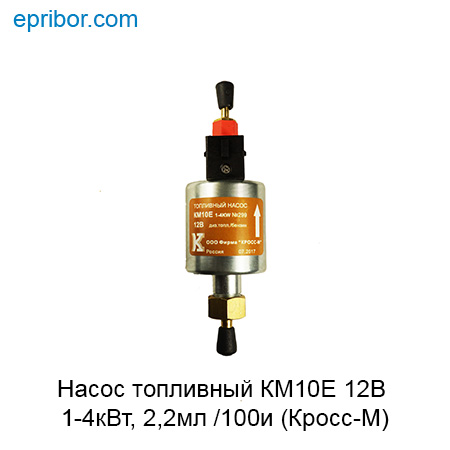 КМ10Е - аналог насосов на отопители и подогреватели "EBERSPAHER" (1-4 кВт) производства Германия. Имеет аналогичный электроразъём и производительность. Расход топлива 2,2 мл. на 100 импульсов (2,2/100).