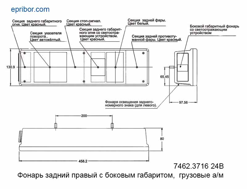 Выполняет функции: габаритного (контурного) огня, указателя поворота, стоп-сигнала, заднего габаритного огня, задней фары, заднего противотуманного огня, бокового габаритного фонаря со светоотражающим устройством.